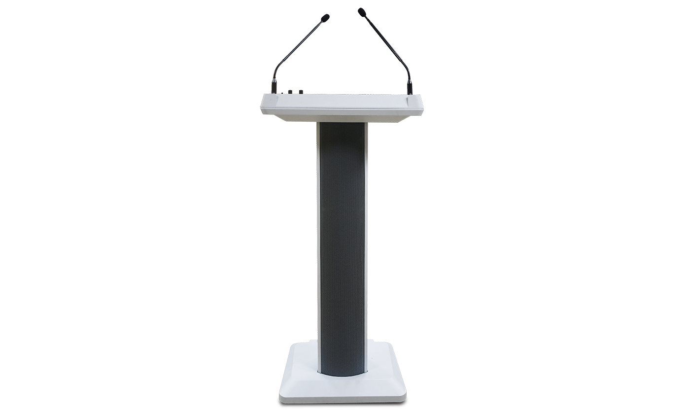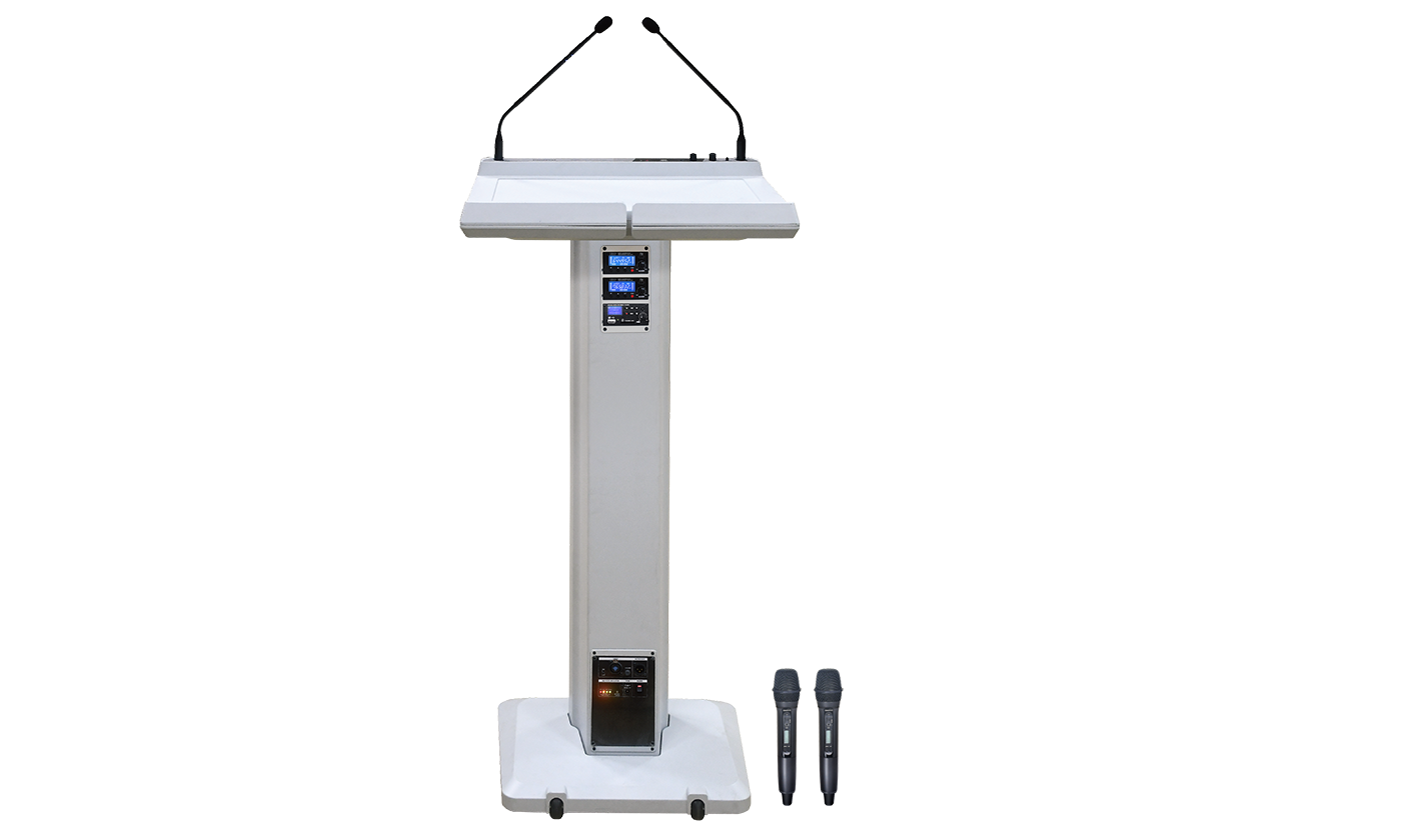The DWS-1000 is a compact and professionally designed multifunctional wireless smart podium, that can be deployed in various scenarios such as education for training, conference presentations, commercial exhibitions, lecture and seminar halls, religious events, stage performances, and hospitality venues. This multifunctional smart podium has a built-in amplifier that combines a column speaker, telescopic adjustable gooseneck microphones, wireless microphone, MP3 recorder/player, and battery operated, all into one unit. It eliminates needing external speakers, amplifiers, wireless microphones, mixers etc.. It does not require an additional power source, making it easy to move and allowing full control of every speech or presentation with a breeze...!