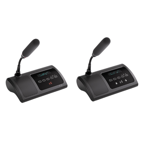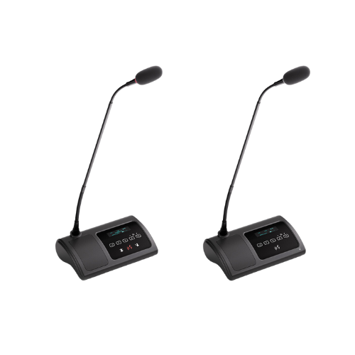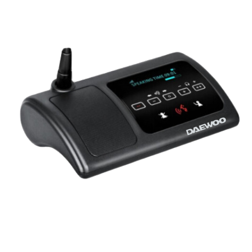 This sleek, modern device features a touchable interface and allows wireless setup within minutes. It includes 5 voting buttons, a detachable battery with 24-hour usage (40-hour standby), and a DC connector for direct power. The unit offers a high-fidelity speaker, optional 3-channel interpretation, pluggable microphones, and a 2.23-inch OLED display with signal, battery, time, and date indicators.