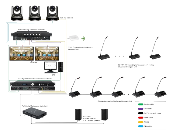 The system is no additional cabling and testing and run under the 25-meter radius of Wi-Fi signal which is full 360-degree coverage. All microphone units automatically identify the access point and communicate with WPA2 secure connection to ensure the conferencing safety.