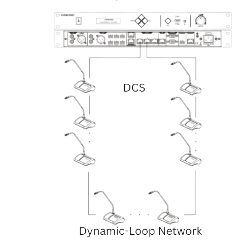 The advanced digital ring network technology supports 64 audio channels via a single CAT5e cable with lossless 48kHz transmission and a 20Hz-20kHz range for superior sound quality. Each microphone offers independent audio and ID outputs with role-based voice separation. The controller manages up to four zones, supports cascading for larger setups, and ensures uninterrupted operation. Key features include 16-segment EQ, noise gating, auto-mixing, feedback suppression, zoned sound output, echo cancellation, USB recording, and PoE speaker support, making it ideal for scalable and professional conferencing.